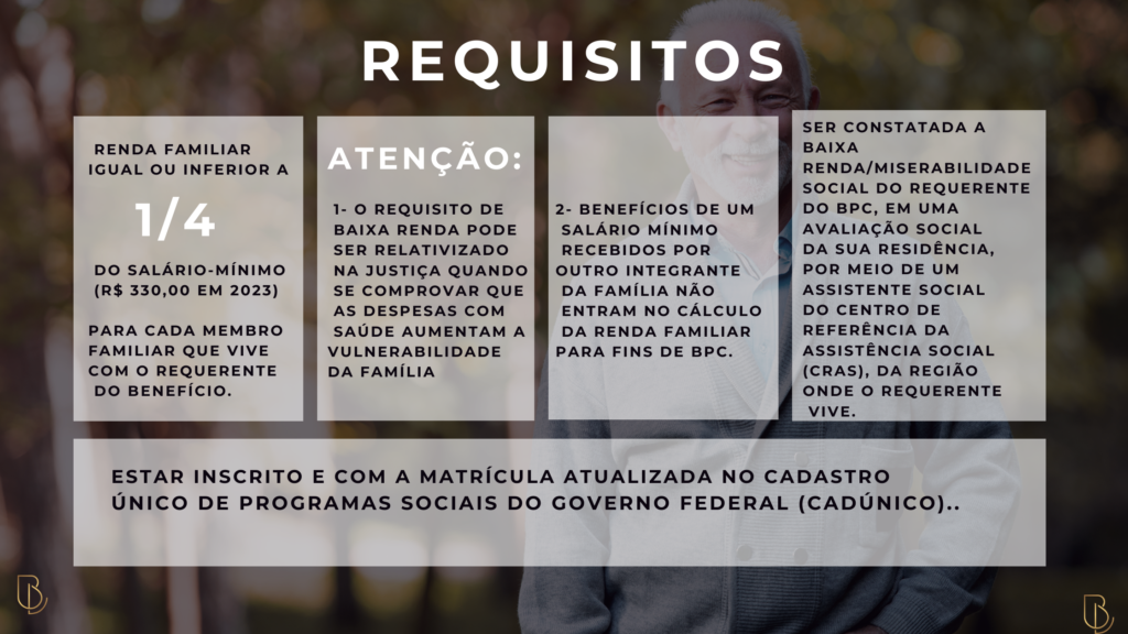 O BPC é destinado a pessoas em situação de vulnerabilidade, sejam idosos com idade igual ou superior a 65 anos ou pessoas com deficiência. Para ter direito a esse benefício, o requerente deve preencher os seguintes requisitos: