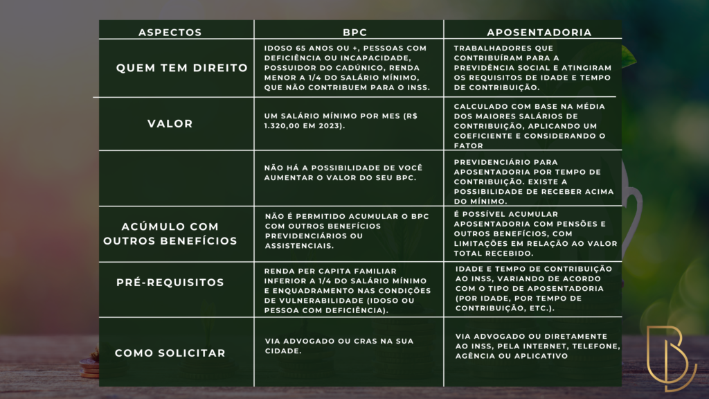 Embora os dois benefícios sejam concedidos pelo INSS, o BPC não é uma modalidade de aposentadoria, mas sim um auxílio para pessoas idosas ou deficientes em situação de vulnerabilidade social, de caráter assistencial e provisório.